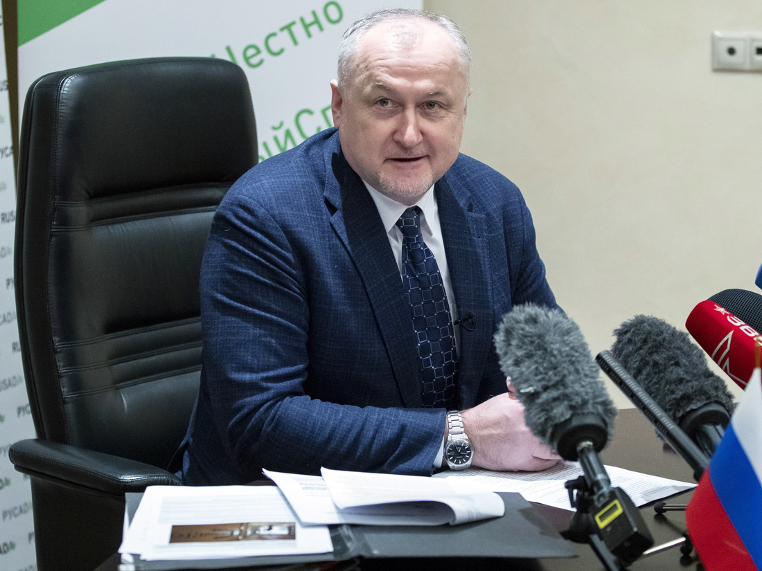 Russian National Anti-Doping Agency head Yuri Ganus speaks to reporters in Moscow in January.