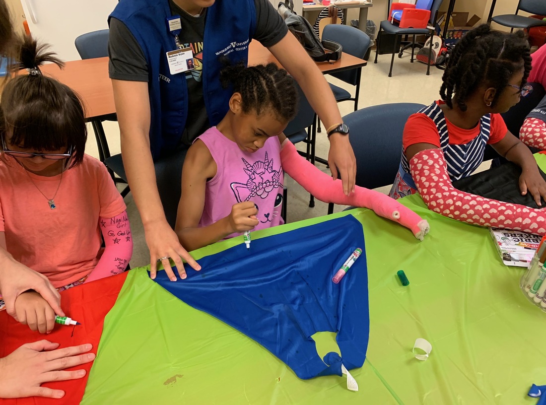 At Nashville’s “High Five” camp, 12-year-old Priceless Garinger (center), whose right side has been weakened by cerebral palsy, wears a full-length, bright pink cast on her left arm — though that arm’s strong and healthy. By using her weaker right arm and hand to decorate a cape, she hopes to gain a stronger grip and fine motor control.