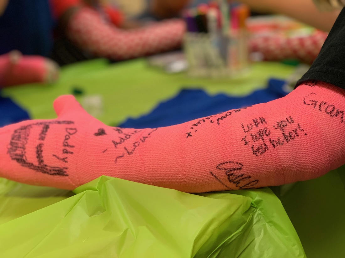 The kids’ temporary casts end in a mitten shape to minimize any wiggle room and attempts to rely on that stronger hand while at camp.