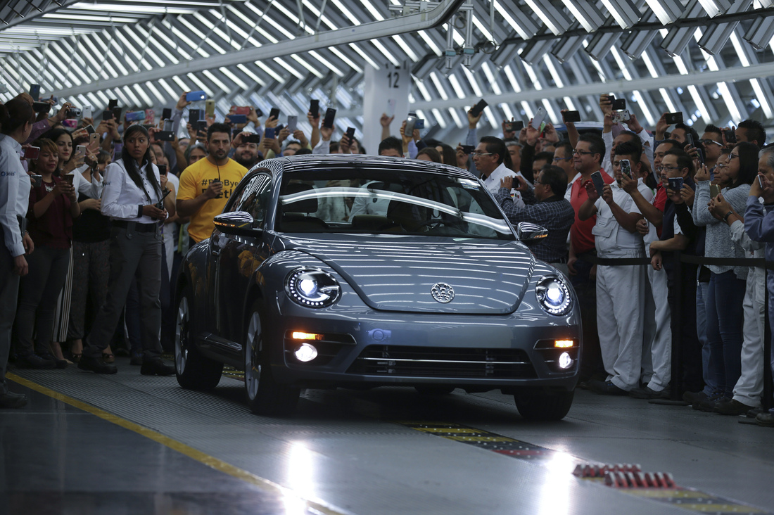 Employees take photos of the Final Edition version of the Volkswagen Beetle, painted “stonewash blue” according to the company, as it rolls out at the production plant in Puebla, Mexico. The last Beetle is not for sale, but destined instead for a museum.