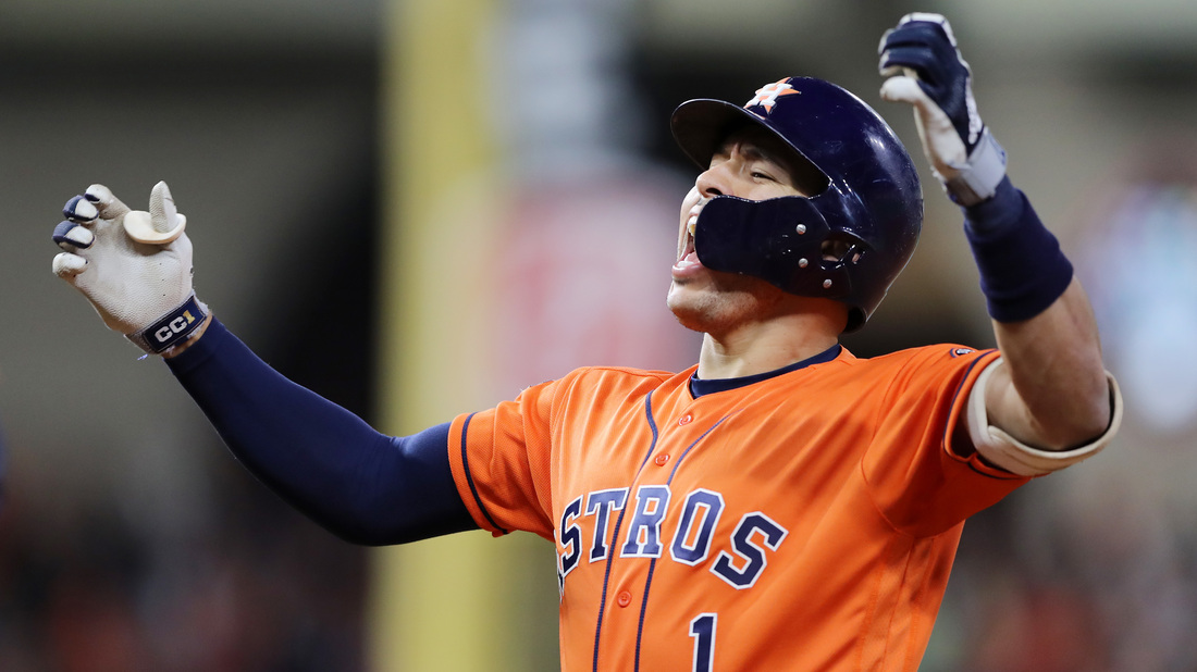 Carlos Correa celebrates after hitting an RBI single for the Houston Astros against the Washington Nationals during the fifth inning in Game 7 of the World Series.